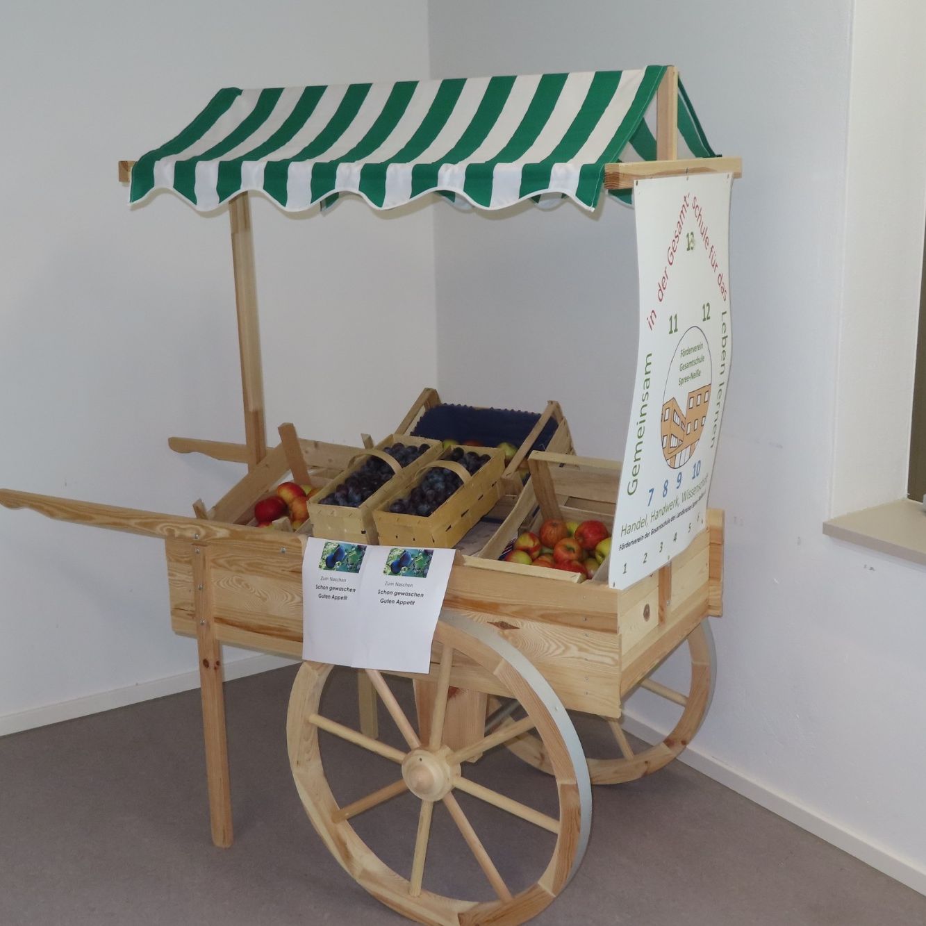 Jeder Schüler und jede Schülerin, der/ die es wünscht, kann sich kostenlos, zum sofortigen Verzehr, Obst aus dem sich im Mensabereich befindlichen Karren (hinter dem LWG Trinkwasserspender) nehmen.
